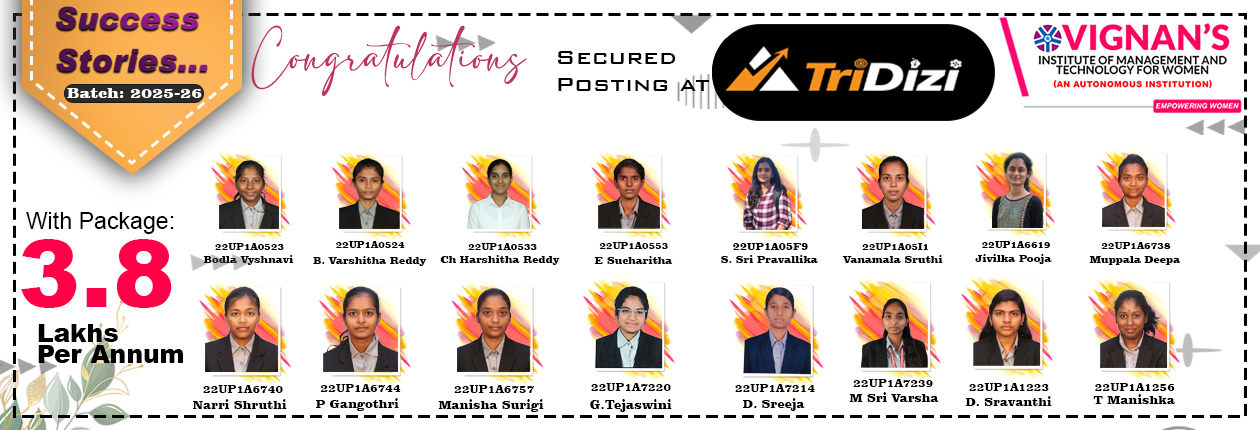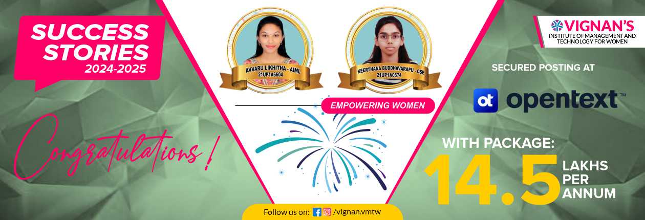 Vignan approaches best education and excellence in Technology and science with a modern outlook. Academic excellence, our prospectus gives undergraduatesanawareness of the real world; with inspiring, ground-breaking entrepreneurial learnings. Industry Relevance CorporateExposure Freedom of thoughts & Expression Exclusively courseisoffered with number one facilitates.Apply application of theoretical concepts to real world challenges. Inter-Disciplinary learning ensures that our students gain information and perception over various subjects. VMTW stand for honesty and integrity with innovative curriculum, values and ethics, most picturesque and oxy-rich campuses.